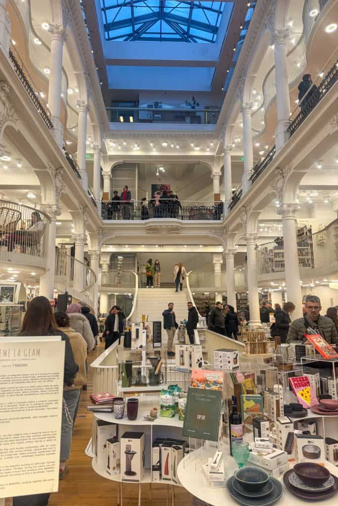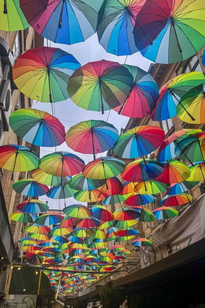 Just off the main boulevard, Pasajul Victoriei, better known as Umbrella Alley, is one of Bucharest’s most Instagrammable spots. Its colourful canopy of umbrellas makes a cheerful photo stop and a good place to stop for coffee or gelato. A few minutes away, Cărturești Carusel, a restored 19th-century bookstore, is equally photogenic, with sweeping white balconies and a spiral staircase that make it a favourite among photographers.