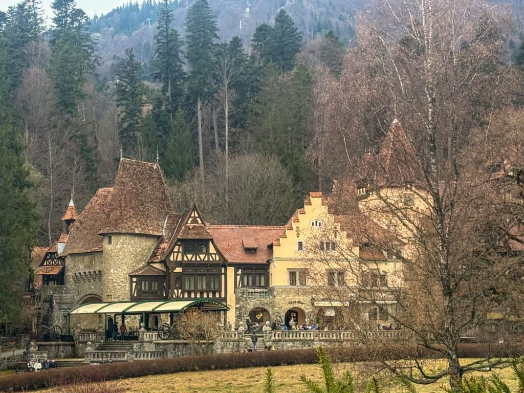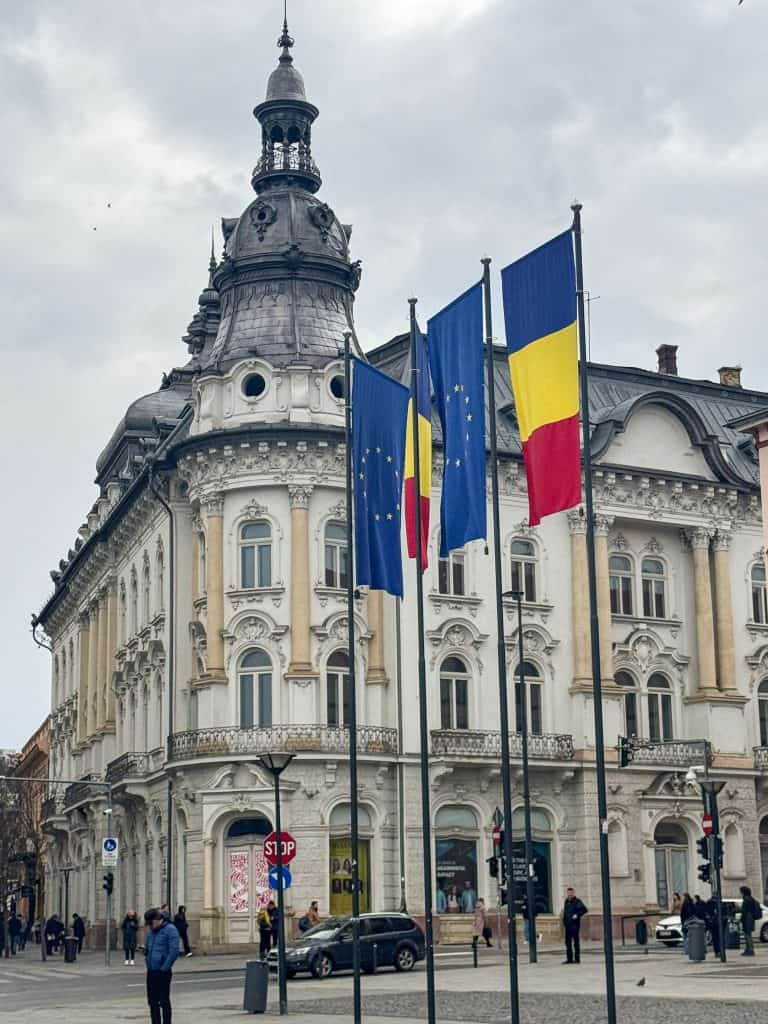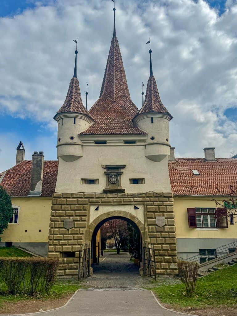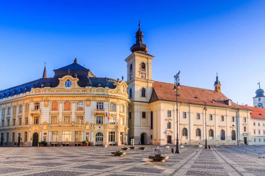 A wide view of Brașov’s Council Square with the historic Council House and its tall clock tower in the centre, surrounded by colourful medieval buildings with red‑tiled roofs. People walk across the patterned stone plaza under a dramatic, cloudy sky, with pigeons scattered around the square.
